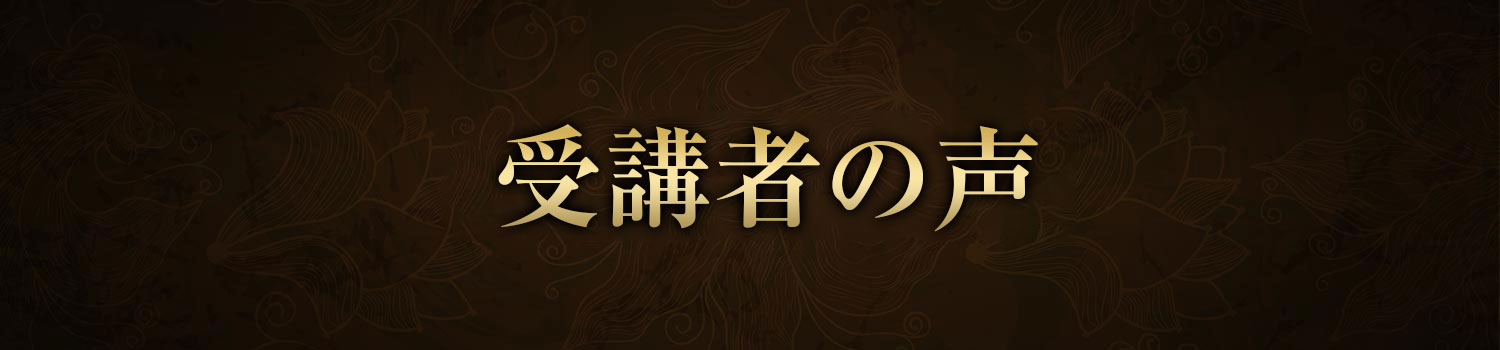 伝ちゃん先生に教えてもらった作法を覚えて毎日するようにしました。今までイヤだった重要な取引先との交渉で、何か知らないけれどもこっちの流れになって成約に結び付いちゃったんです。今までも、ありがとうとか感謝することは実践していたので、普通の人よりもついているほうでしたが、教えてもらったことを作法をするようになって、もうすごくついててちょっと怖いな というぐらいついている自分を感じています。すべて伝ちゃん先生が言っている方法で行ったらうまく行くんだなって、これからも本当に心配なくいけそうな気がしています。